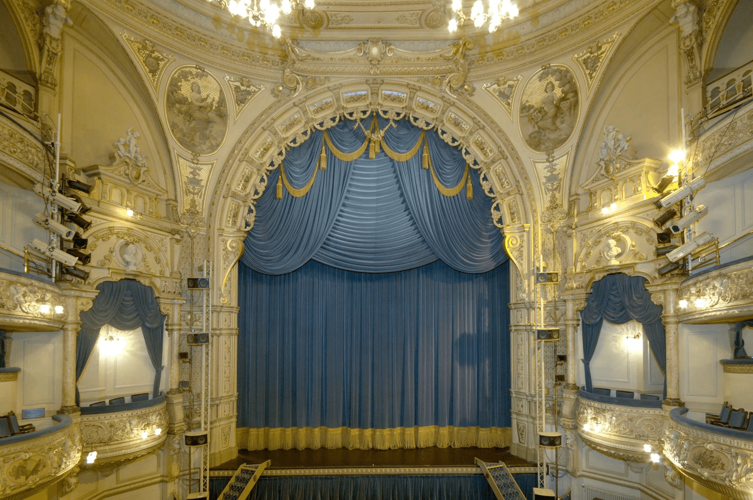 The auditorium at the Blackpool Grand Theatre. View of the stage, with pale blue stage curtain drawn. The boxes also seen.