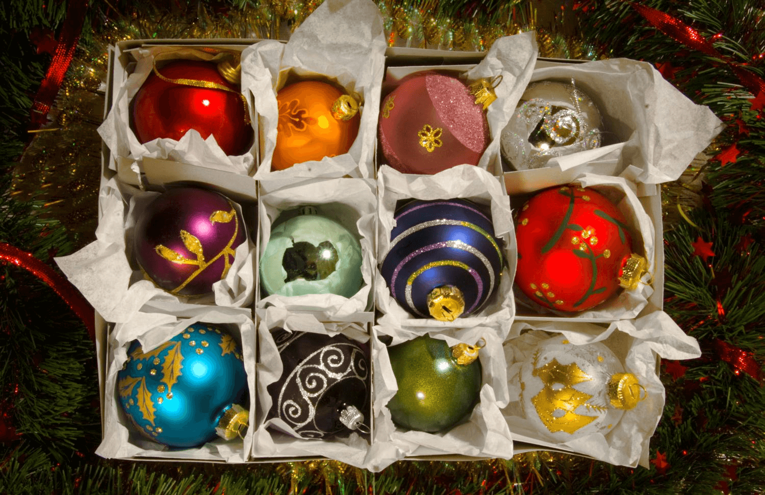Colourful vintage baubles in a box on a background of Christmas tinsel.