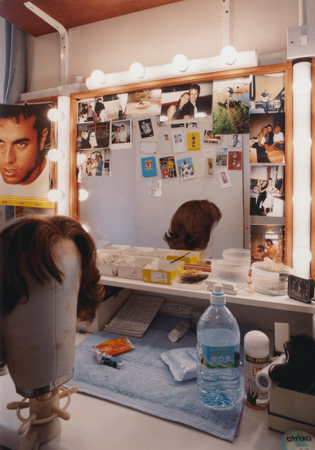 Dressing table with lights around the mirror. A wig sits on a mannequin head. Photos surround the mirror.